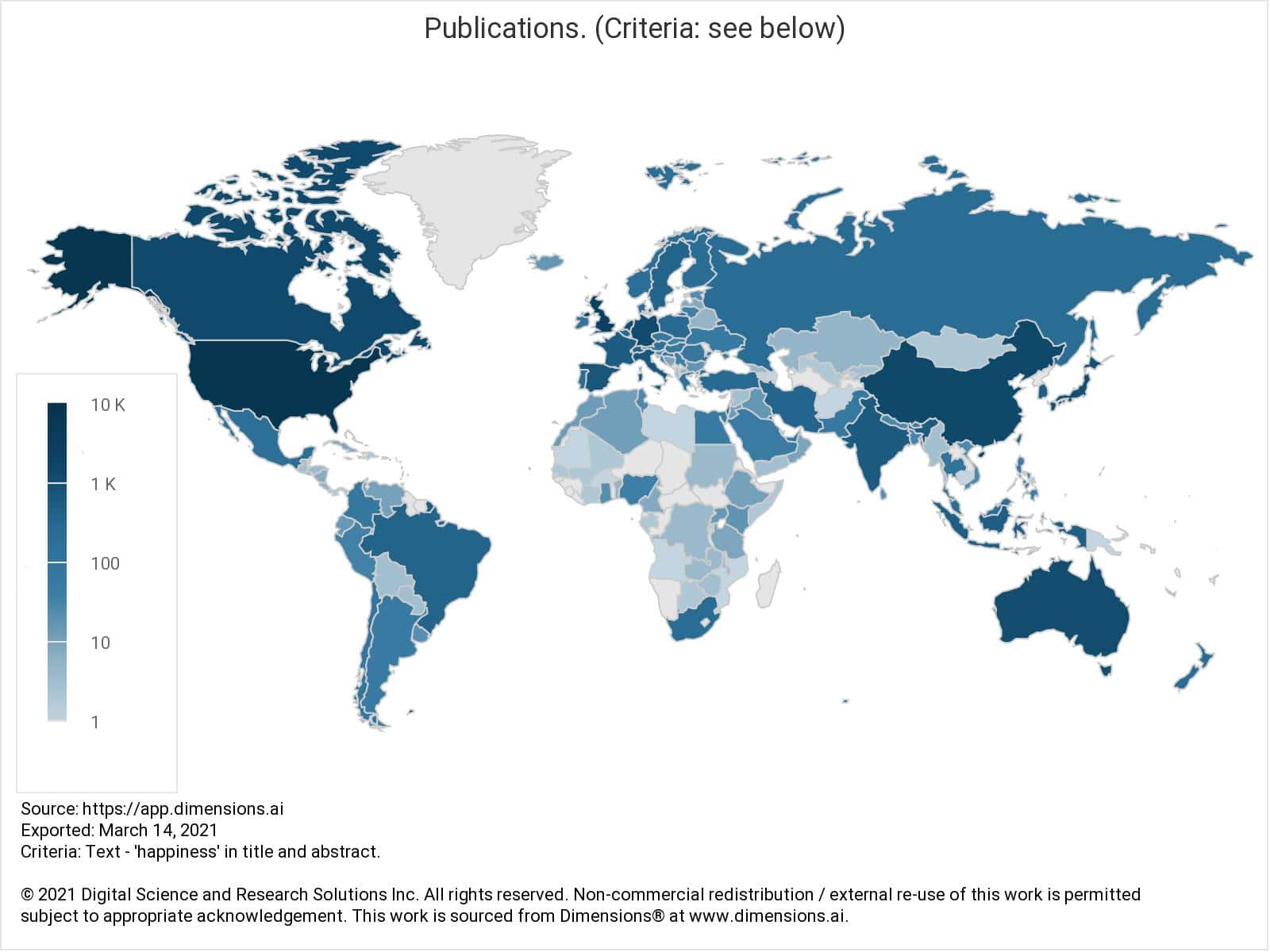 Happiness is a human emotion, but does happiness research take place wherever there are people? Not quite. Figure 2 shows the global distribution of publications relating to happiness. The US has had the highest overall happiness research output with about 7,700 publications, followed by the UK with almost 2,700. China (with 1,386), Canada (with 1,375) and Germany (with 1,257) make it a close-run race for 3rd place, while other countries such as Australia, the Netherlands, and Japan are hot on their heels.