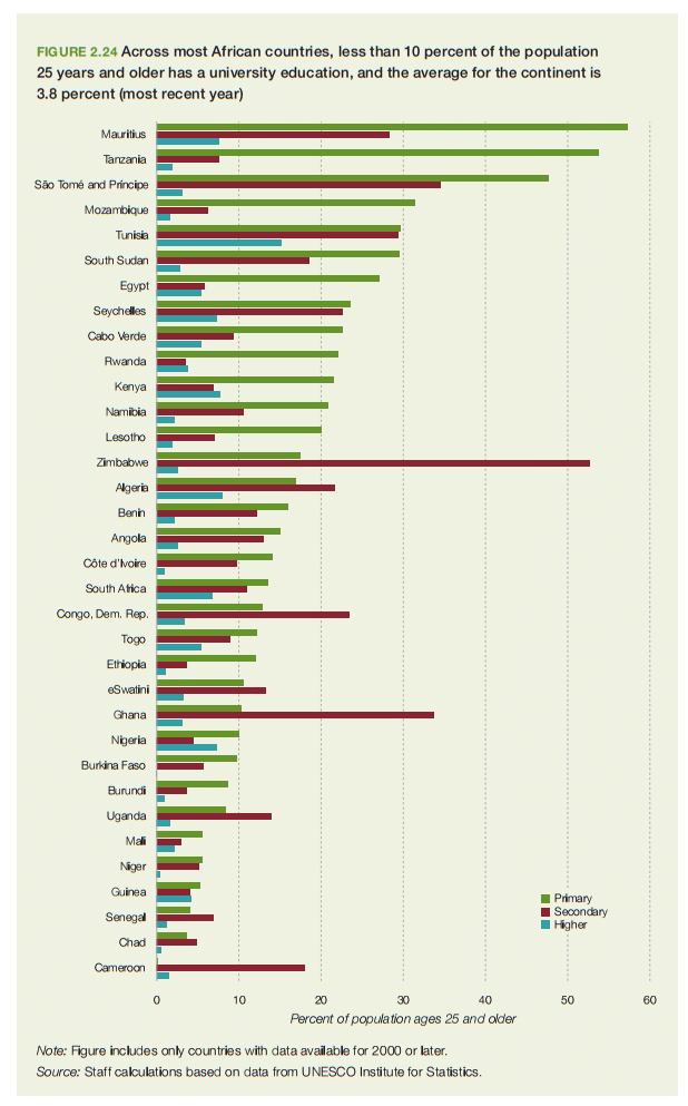 According to the African Economic Outlook Report of 2020 by the African Development Bank, less than 10% of the population aged 25 years and older have a university education across most African countries.