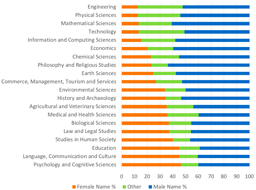 - The proportion of researchers’ names that could not be identified by the gender guesser increased as the field of research moved from Arts and Humanities to STEM, an area which has traditionally attracted more people of Eastern ethnicity. Making gender research such as this more inclusive and truly representative calls for improvements to be made to the gender guesser program