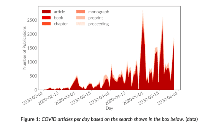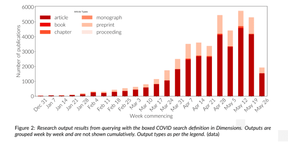 - As of 1 June 2020, there have been upwards of 42,700 scholarly articles on COVID-19 published, 3,100 clinical trials, 420 datasets, 270 patents, 750 policy documents, and 150 grants.