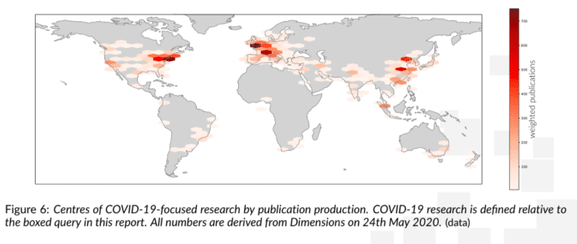 - A density map of global COVID-19 paper production shows there are three to four major centres of research: an extended area in China composed of several cities—Wuhan, where the virus is alleged to have started, Beijing and Shanghai; Europe, specifically Italy and the UK, two of the harder-hit countries; the US’s east coast research corridor including Boston and New York; and finally, a lighter focus from the Californian institutions on the West coast.