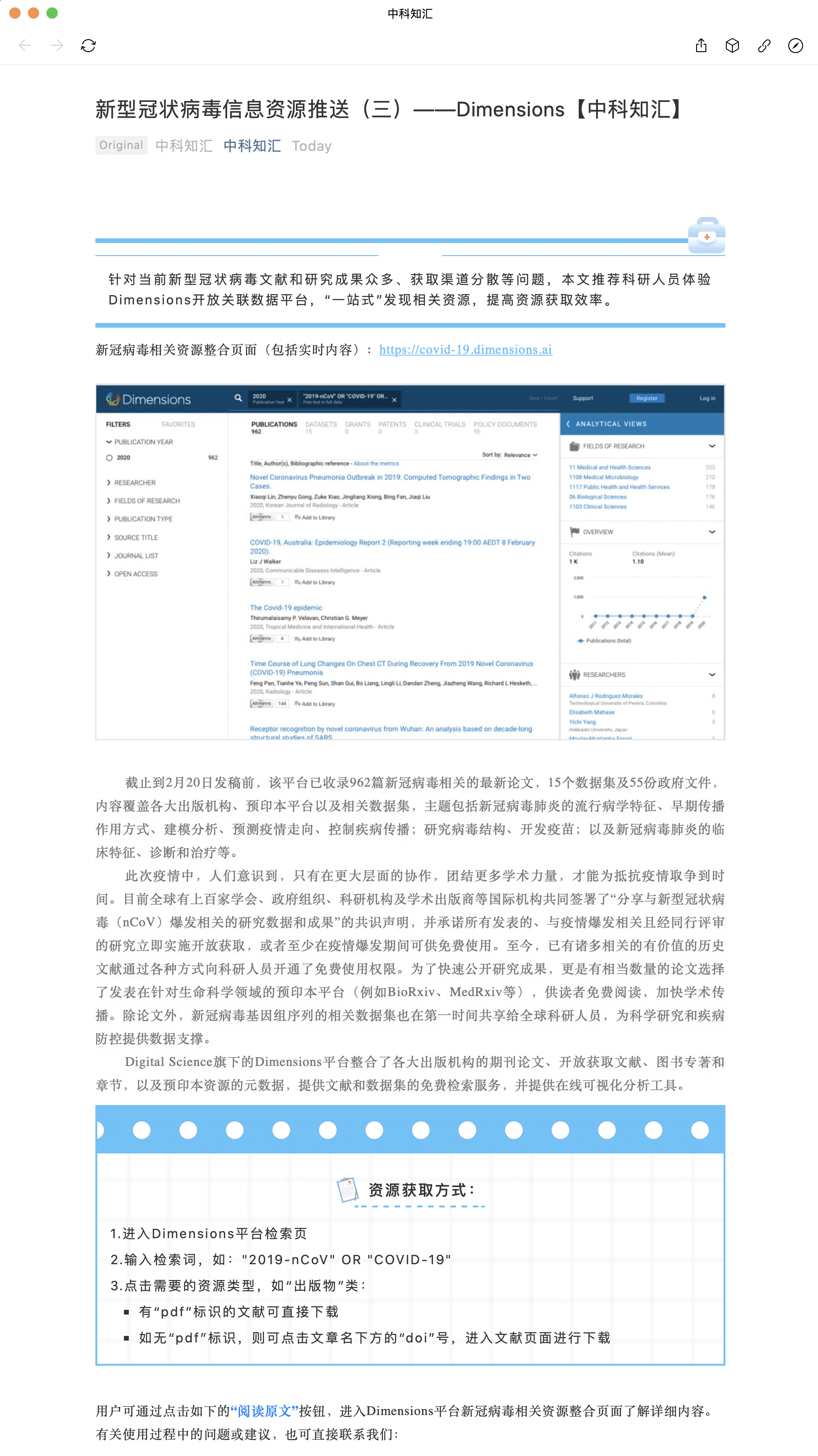 Today the Chinese Academy of Sciences (CAS) has recommended Dimensions as a cross- publisher one-stop-shop for all research outputs. In order to provide easy access to information regarding this recent outbreak, Dimensions have also created a deep link to a suggested search for the COVID-19 virus: https://covid-19.dimensions.ai.