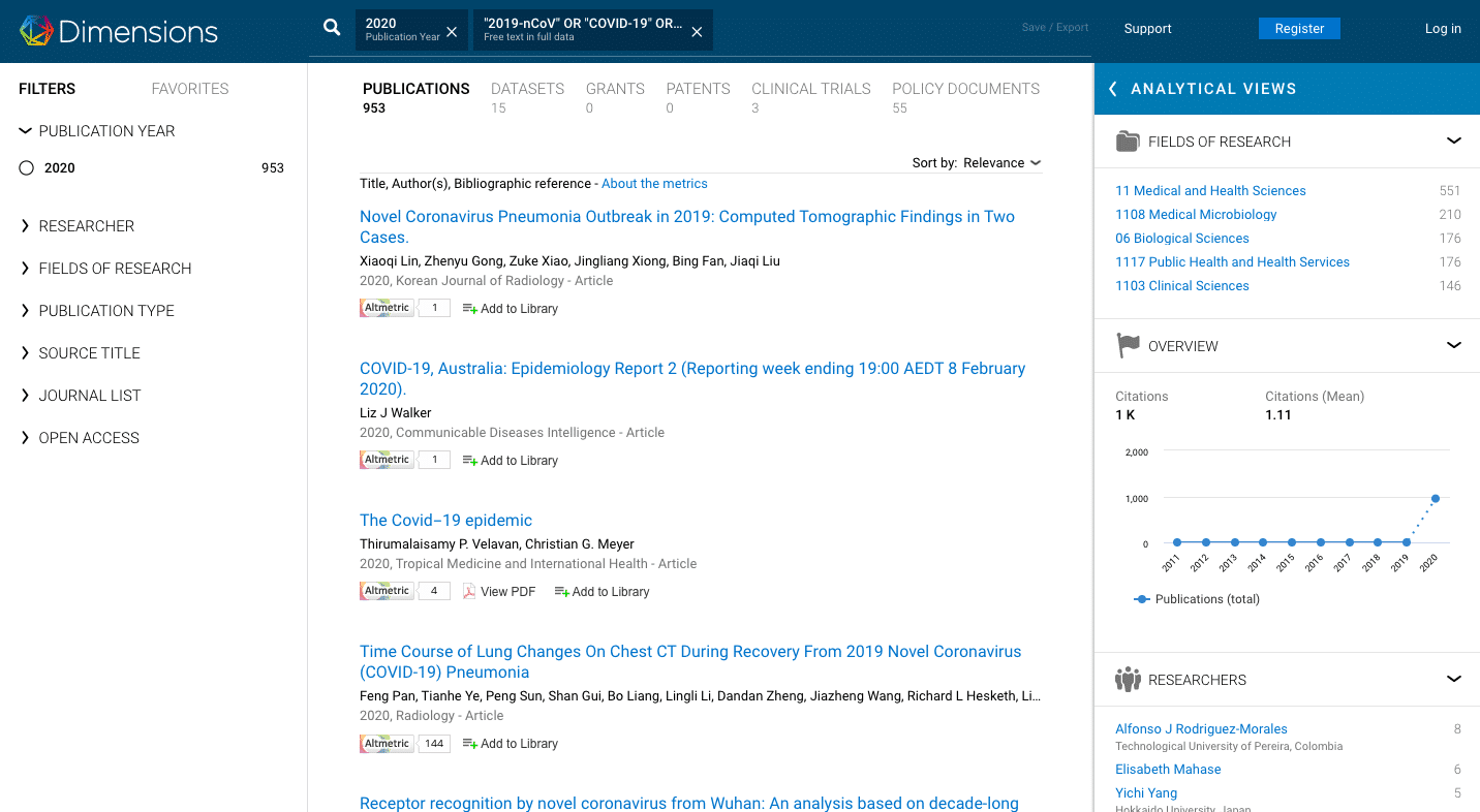 CAS’s suggestion to use Dimensions during this time highlights the main reason behind why we designed Dimensions. From day one we wanted to give researchers a free and open tool for search, context and discovery. Dimensions contains 108 million publications linked via more than 1.2 billion citations for all areas of research, all collated in one place, negating visits to multiple websites to obtain a balanced snapshot of the research being carried out in any given area. An increasing number of these publications are focused on combating the impending crisis of COVID-19. We recently added 1.5 million openly searchable datasets as a sixth form of research output; to date there are already 15 datasets that relate to COVID-19: