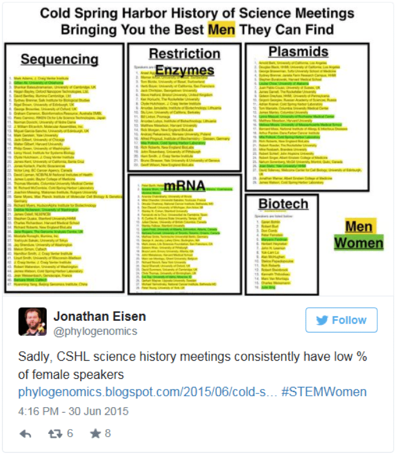 A great instance of allyship that deserves recognition is how Prof Jonathan Eisen, one of my fellow-panelists, uses his senior academic position and all the privileges that come with it to name and shame organisations that have poor gender representation in their conference speaker lineup. Here is a tweet where he calls out Cold Springs Harbor Laboratories for having a low percentage of women speakers at their conferences.
