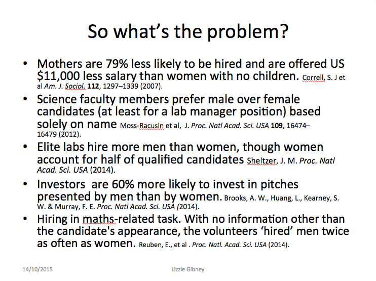 Lizzie Gibney (@lizziegibney), reporter at Nature, spoke about recent media coverage of sexism rows, for example Tim Hunt’s infamous comments and Matt Taylor’s #shirtgate, who she actually interviewed as a reporter. Lizzie also highlighted some powerful and illustrative statistics, which showed the breadth and extent of the under-representation of women in STEM and the challenges they face.