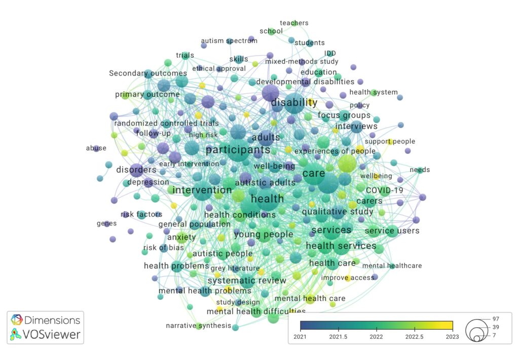 In a concept analysis of autistic-contributor research literature, I found a clear emphasis on lived experience, health services, and support systems. Instead of primarily asking “What causes autism?” or “How can we diagnose autism?”, this research asks “How can we improve the lives of autistic people?”. This emphasis is reflected in the prominence of terms like “improve access” and “health system” in the autistic-contributor research network visualization above.
