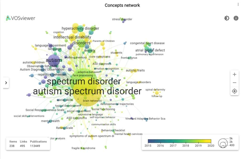 This focus contrasts with broader clinical autism research, which emphasizes cognitive and behavioral aspects of autism. In the clinical autism concept network above, the strongest themes are diagnosis, social skills, and behavior.