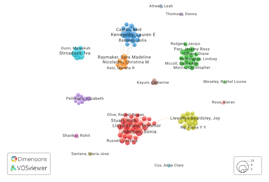 This network visualization represents a preliminary attempt to identify leading neurodivergent researchers engaged in autism and neurodiversity scholarship. While the search terms were designed to highlight self-identified neurodivergent researchers and allies, it’s important to note that this method may not be fully accurate, and not all individuals included may identify as neurodivergent. The visualization highlights key figures like Sonia Johnson, Fiona Ng, and Dora Madeline Raymaker, who are known for their work in this area and could provide valuable leadership on best practices for autistic inclusion in research.