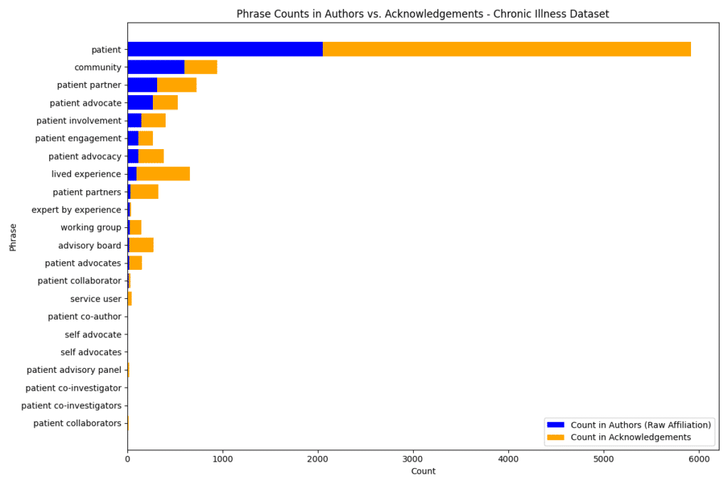 Patient representation: The term “patient” emerges as a frequent descriptor in research acknowledgments. It can encompass diverse roles like “patient partner,” or refer to administrative functions related to patient involvement. However, the meaning of “patient” in the author affiliation and acknowledgements section can be ambiguous, sometimes signifying autistic individuals themselves, other times denoting individuals with different conditions within the study.