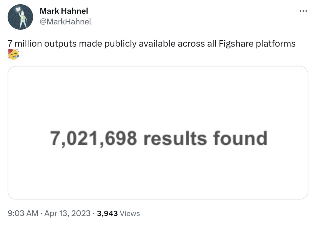 On April 13th 2023, Mark tweeted that Figshare had reached seven million outputs, a significant milestone in anyone’s book! He and I jumped on a quick call to discuss what that achievement means for Figshare, and before we knew it our chat had meandered onto what it was like in the very early days of Figshare and Overleaf, and how milestones and celebrations change as the numbers keep going up and to the right! 🙂