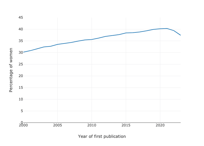 I started the analysis in 2000, using Dimensions.ai data in Google Big Query (GBQ) and Gender API data, which classifies gender from first names, using their probabilities to be used by a man or a woman. Metadata of research articles have changed since the 2000s; authors and journals at the very start of the period often recorded initials of authors, with women more likely to use them in order to hide their gender. If possible, Dimensions algorithms will have consolidated a profile with publications that had initials only and the first name, making it possible to track it in our analysis, but for women at the start of our period, especially those with a short career, it is possible that their gender is under reported. On the other hand, women would often change their name at marriage / divorce, making it impossible to track their profile if they had published before and therefore creating multiple “first publications”.