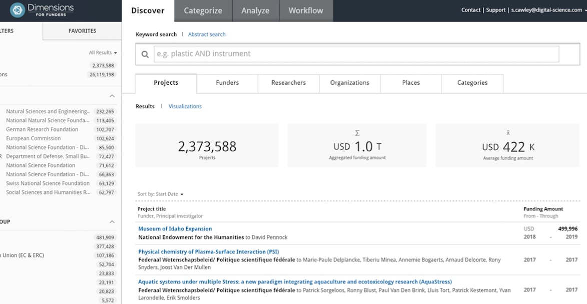 The Dimensions database allows users to look into the future: More than $300 billion are attributed to research funds of current, active projects – allowing a clear view on the research which will be undertaken in the forthcoming years. This information is vital to funders and government organisations who can then analyse the direction of scientific and academic research, and influence the resource distribution in the research system in real time. Grants found in the database are available for users to import and assign to their ORCID record in bulk using the ÜberWizard for ORCID.