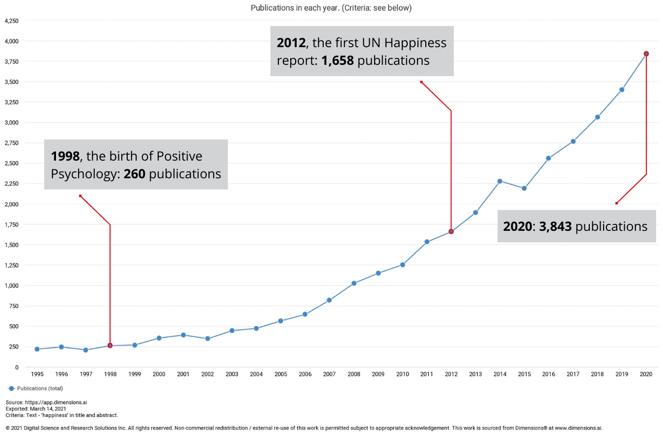 When we track the volume of research publications over time, we see that research into happiness and subsequent publications start increasing significantly in the early 2000s. This interest in happiness is connected to the study of Positive Psychology.
