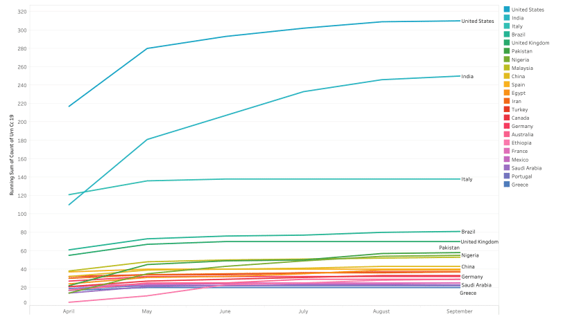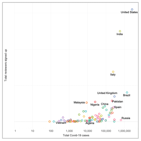 Analysis of reviewer sign-ups & total Covid-19 instances to June 30 by geography. Source: https://ourworldindata.org/