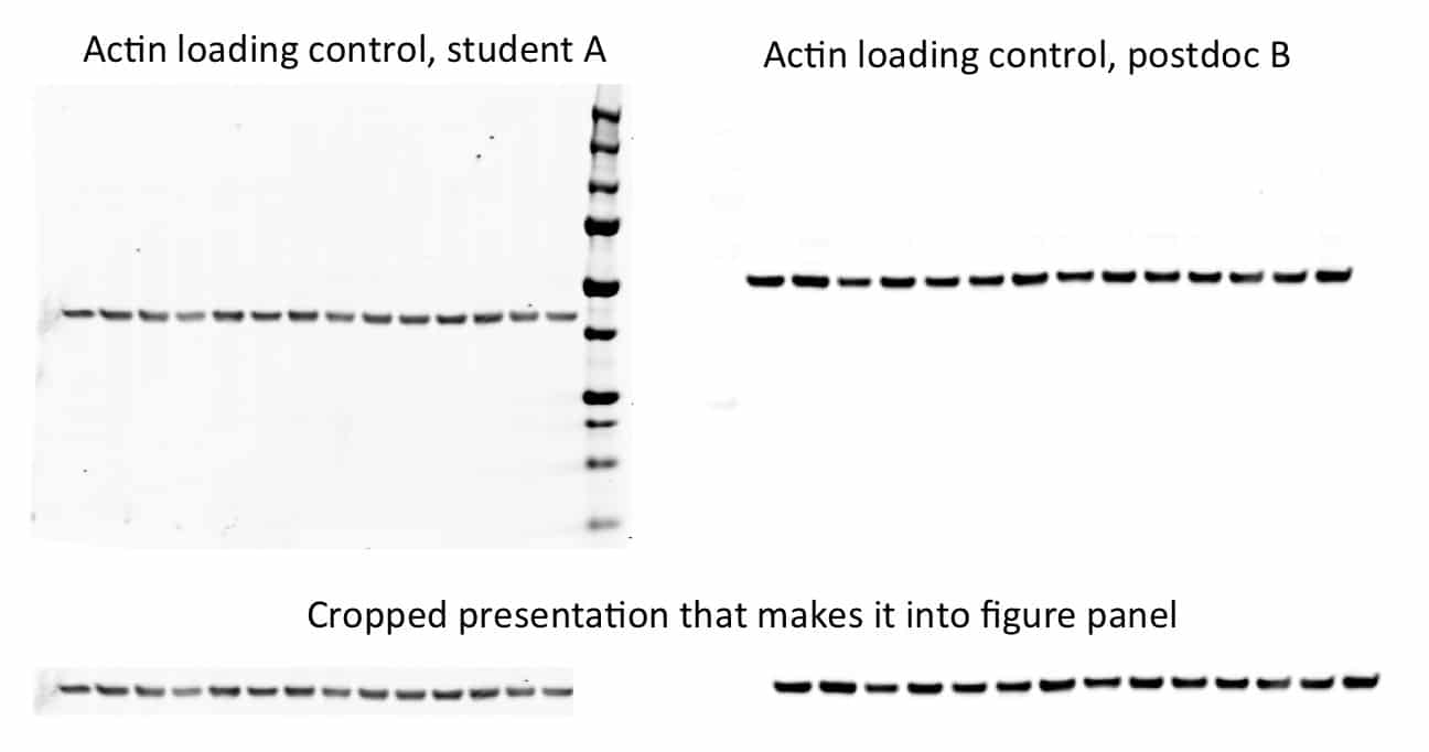 First, for those of you on the other side of the publishing fence, let me tell you what a Sisyphean task it is to get a paper published. Here is the rundown of a typical publishing experience: submit to journal A, they reject without review after a month or so. Submit to journal B, they have it reviewed, send it back two months later, asking for revisions. We do more experiments and send it back to journal B six months later. They then reject it so we re-format and send to journal C who review and ask for more changes (with another delay of a couple of months). We then do more experiments, revise again and journal C finally accepts the paper. In this example, we have gone through five major revisions of the paper over the course of a year, all of which involve moving the figures around. This figure rearrangement is where mistakes can easily creep in. Take a look at these examples of loading controls for Western blots from different experiments.