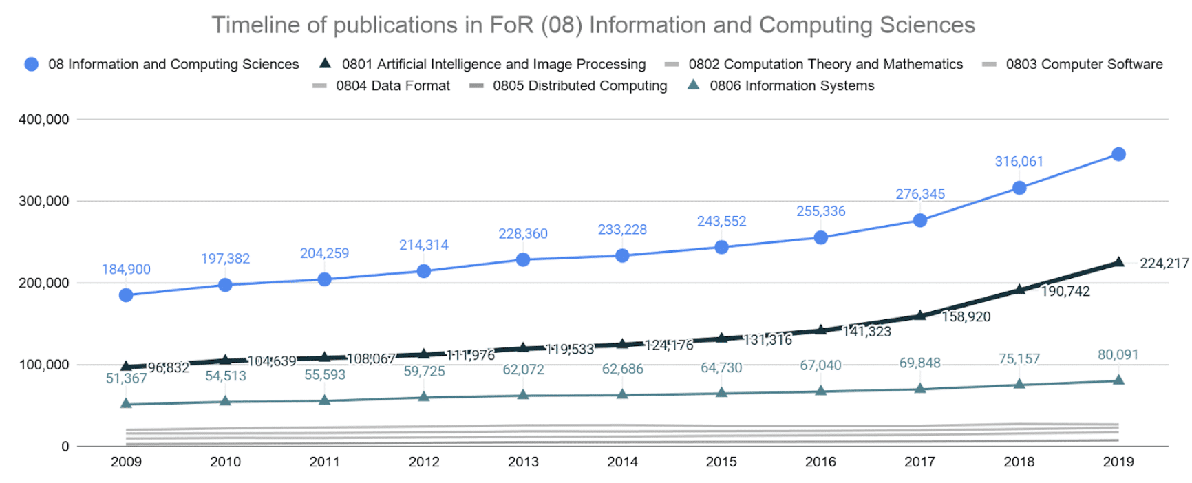 Figure 1: The publication growth for AI and image processing (a subcategory of Information and Computer Sciences) was 131.6% between 2009 and 2019. This compares to a total growth of 93.2% for all subcategories in Information and Computer Sciences over the same period.