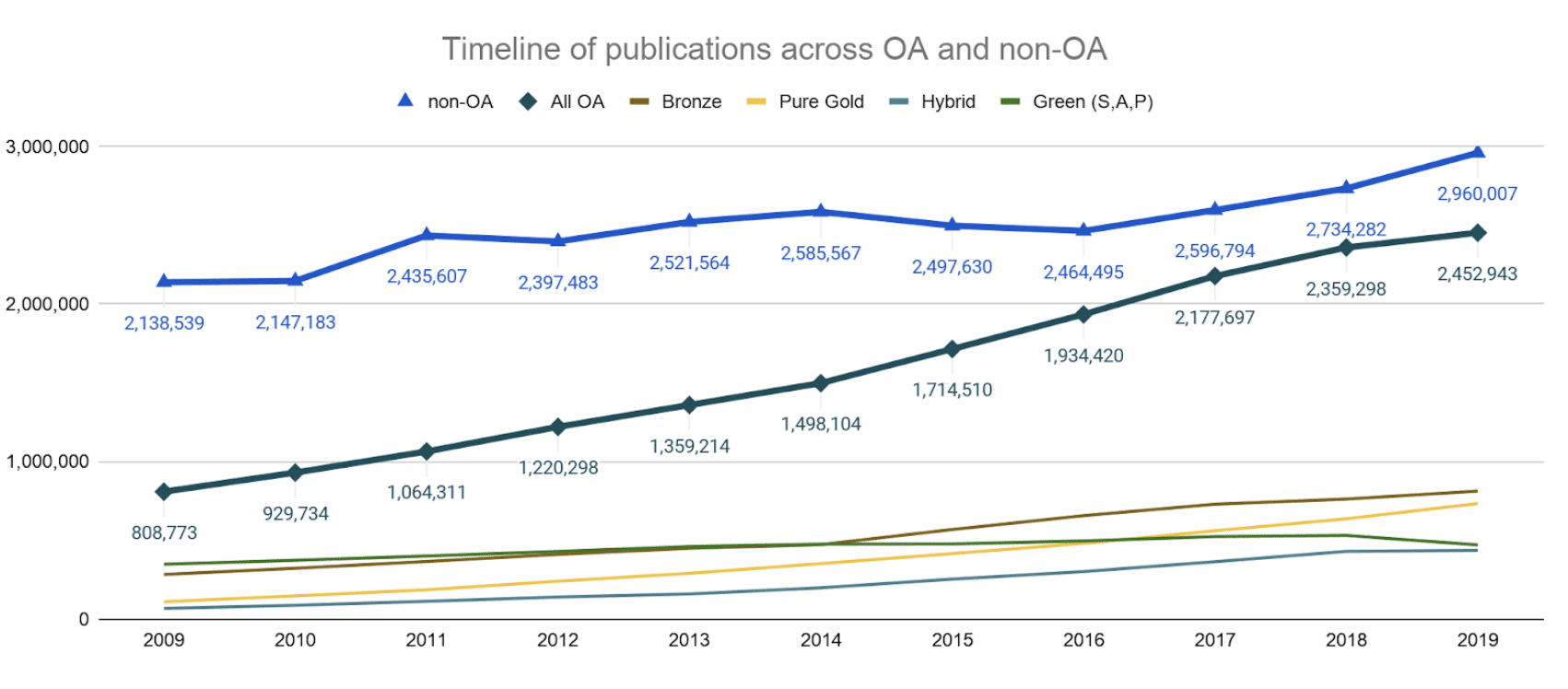 Figure 7: The volume of research published each year is rising. In this graph, which draws on Dimensions publications data, we can see that the growth of Open Access articles is accelerating at a faster pace than subscription publications.