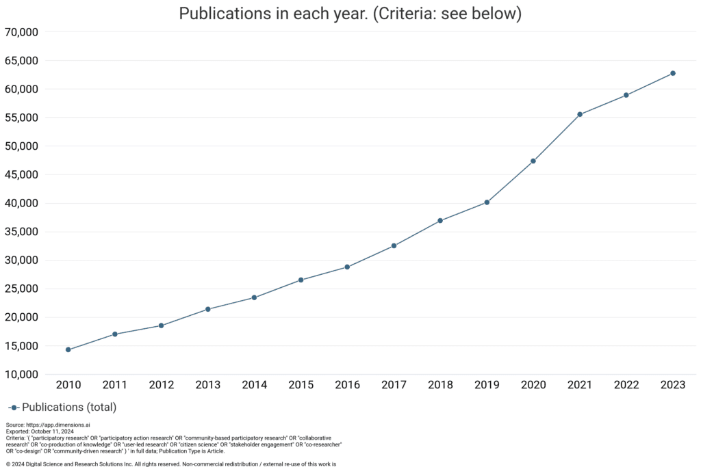 There’s a growing recognition in the research community that individuals with lived experience of a condition or phenomenon can offer unique and valuable insights to the design of scientific studies. This collaborative approach is often referred to as participatory research and actively involves individuals with lived experience in all stages of the research process. Dimensions data (visualized below) reveals a steady increase in research articles using terms related to participatory research, suggesting a growing embrace of this approach within the scientific community. This shift reflects a move towards more inclusive research practices that empower individuals and communities to actively participate in knowledge creation that is directly relevant to the needs and priorities of those it aims to serve.