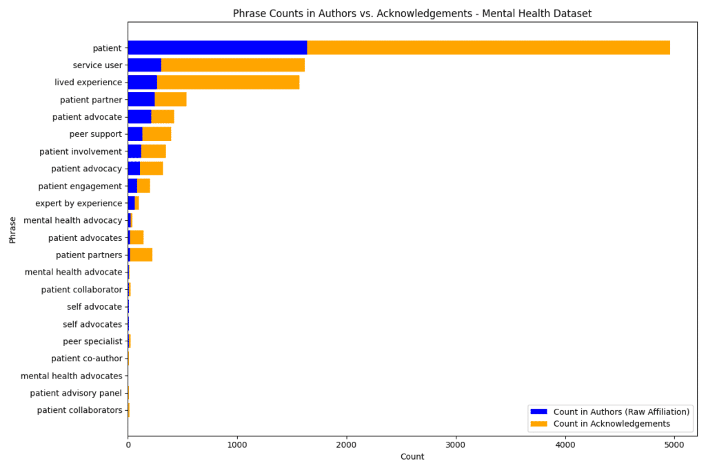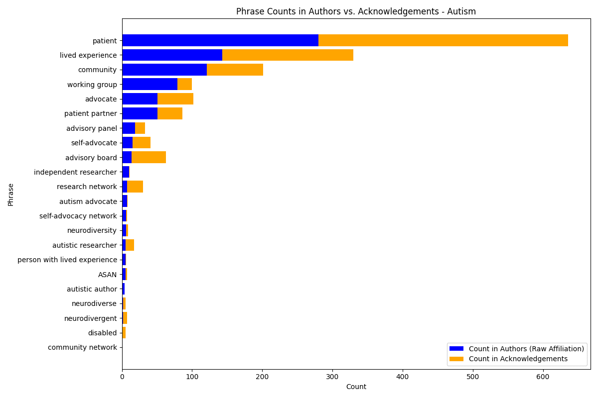 Patient representation: The term “patient” emerges as a frequent descriptor in research acknowledgments. It can encompass diverse roles like “patient partner,” or refer to administrative functions related to patient involvement. However, the meaning of “patient” in the author affiliation and acknowledgements section can be ambiguous, sometimes signifying autistic individuals themselves, other times denoting individuals with different conditions within the study.
