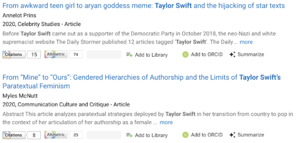But back to the topic at hand. A quick glance at the top line of research outputs shows that, to date, 241 publications have “Taylor Swift” in the title or abstract, as well as 14 data sets, three grants, and one clinical trial. Not bad for someone whose debut album came out in 2006.